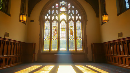 An intricate stained glass window designed with vibrant colors and detailed patterns bathes a historic chapel in soft, serene light, creating a tranquil ambiance.
