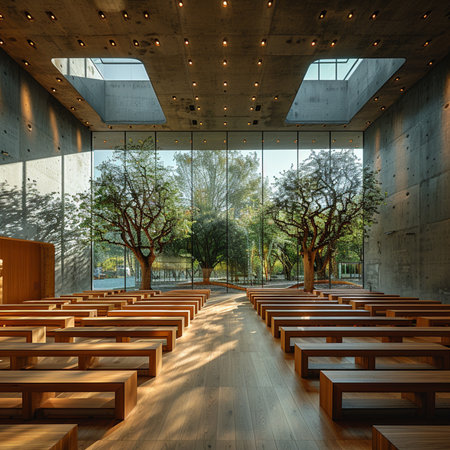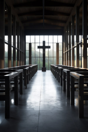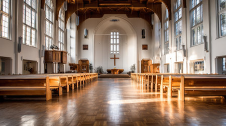 Experience the tranquility of a modern church interior, bathed in natural light, featuring beautiful wooden benches and a prominent cross, inspiring a serene atmosphere for worship.