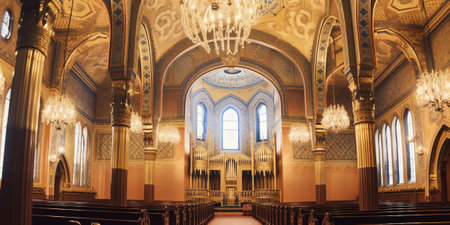Majestic Church Interior with Magnificent Pipe Organ and Wooden Pews Concept of Spiritual Serenity, Architectural Grandeur, Sacred Spaces, and Historic Design.