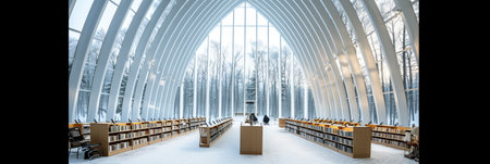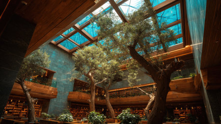 This captivating image showcases the interior of a modern library, featuring olive trees and a striking glass roof that creates a serene and inspiring study environment.