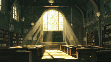 This captivating image features sunlight rays streaming through stained glass windows, illuminating wooden benches in a tranquil church interior, creating a serene atmosphere perfect for contemplation and reflection.