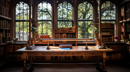 A serene and historic library featuring wooden shelves filled with books. This quiet reading room invites exploration and intellectual pursuit in a charming, classic setting.