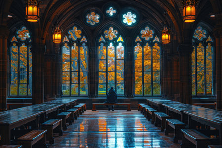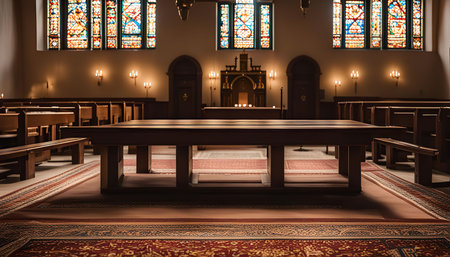 Step into a serene ambiance of a gothic church featuring stunning stained glass windows and intricately carved wooden benches, inviting reflection and worship.