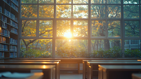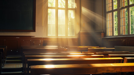 Sunlight streaming through windows into a classroom