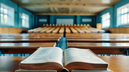 A single open book rests on a wooden desk in a classroom, the rows of desks and chairs behind it blurred. Sunlight streams through the windows, highlighting the books pages.