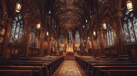Majestic Interior of a Historic Church with Ornate Gothic Architecture and Vibrant Stained Glass Windows Creating a Serene and Spiritual Atmosphere for Worship and Devotion