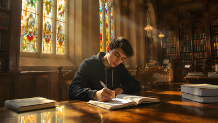Focused Student Immersed in Studying for AR 3:2 Exam in the Empty Library