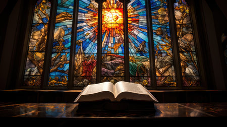 This breathtaking stained glass window showcases intricate biblical scenes, illuminating the elegant interior of a gothic church with vibrant colors and artistic detail.