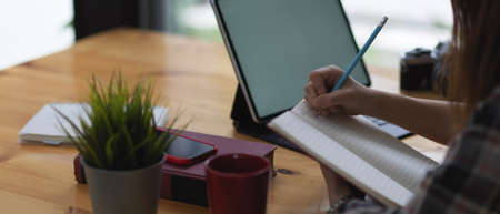 Side view of female hand writing on blank notebook while using mock up tablet on wooden table