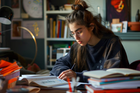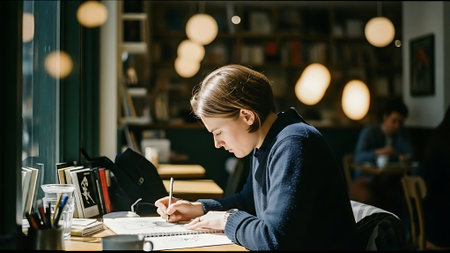 A student is sitting at a desk, focused on writing. Books and supplies are scattered around her, A student sitting at a desk, surrounded by books and notebooks