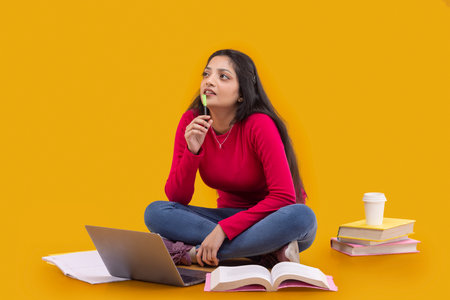 Young woman looking away and thinking while studying with laptop and books
