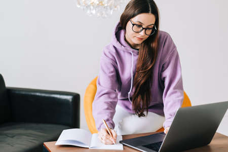 Focused caucasian young woman college student in eyeglasses studying with laptop, distantly preparing for test exam, writing essay doing homework at home, distantly education concept.