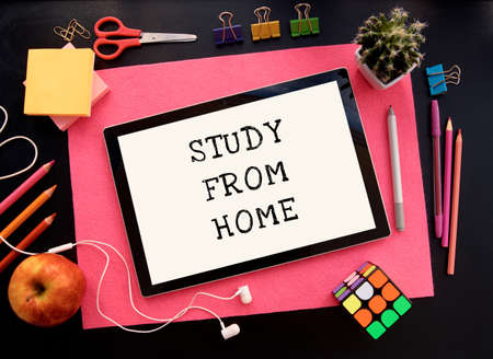 Kiev, Ukraine - July 03, 2020. Study from home. Online education.School supplies top view for advertising and promotional items. Back to school concept. Stationery set on black background.
