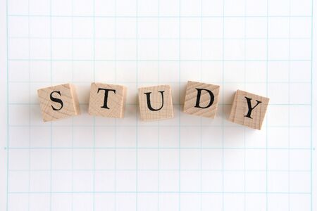 The word learning from letters written on wooden cubes. Defocused numbers. Copy space - concept of education, child development, back to school