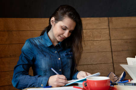 A cheerful girl in a blue denim shirt sitting in a cafe makes notes in a notepad with a pen. On the table sheets of paper, eyeglasses in a case, adhesive tape, felt-tip pens, and red mug