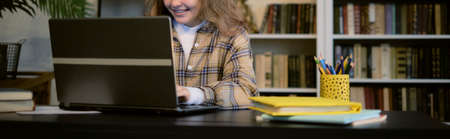Serious teenage girl concentrating on schoolwork while sitting in front of laptop and looking for online information for new project