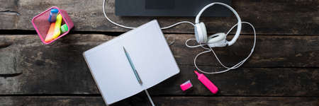Wide view image of open blank notepad lying on rustic wooden desk by a laptop computer with headphones and colorful markers next to it.