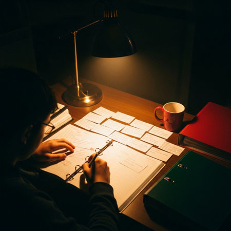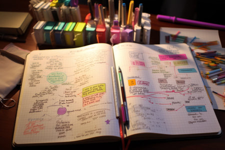 Desk scene with notepad, sticky labels, and open planner under soft lighting