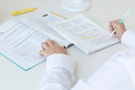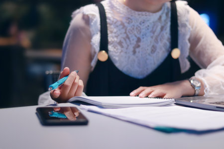 Close up of studying student hands writing in book during lecture education students college of university, Reading, Learning, technology and Exam. Education concept, top view.