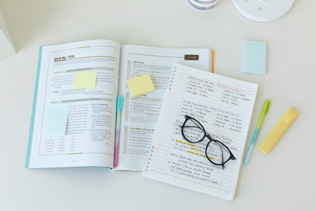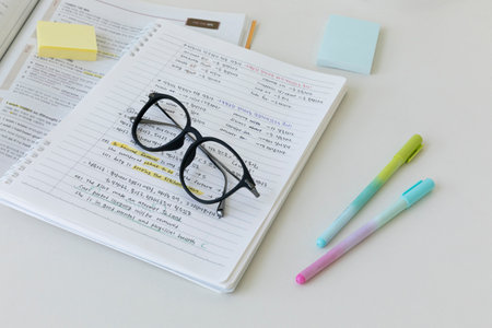 studying at home, study desk setup_handwriting notes and writing instruments glasses