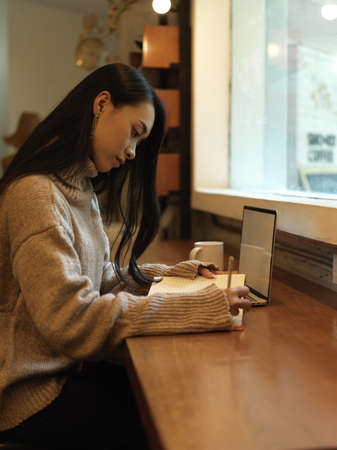 Asian teenage student woman using color pencil to highlight data in paperwork and taking notes while reading a book to studying and learning about education knowledge for preparing test exam in cafe.