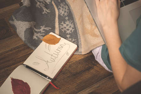 Cozy home composition background with notepad and autumn leaves, young girl using laptop in autumn holidays concept