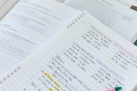 studying at home, study desk setup_handwriting notes and open workbooks