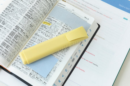 Flat lay of colorful study supplies and textbook open to a highlighted passage in quiet setting