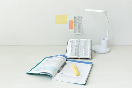 studying at home, study desk setup_dictionaries and workbooks