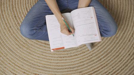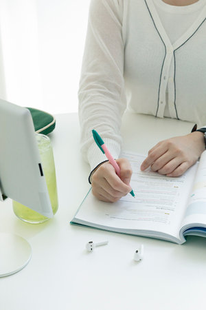 Adult woman studying with text at home