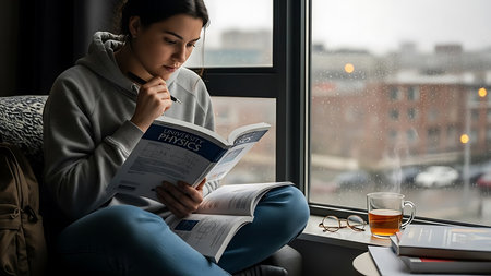 A student focuses on their studies at a tidy desk featuring a laptop, open textbooks, notes, and snacks. Afternoon light brightens the cozy room, creating a productive atmosphere.