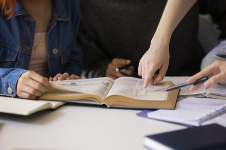 High school or college students group catching up workbook and learning tutoring on desk and reading, doing homework, lesson practice preparing exam.