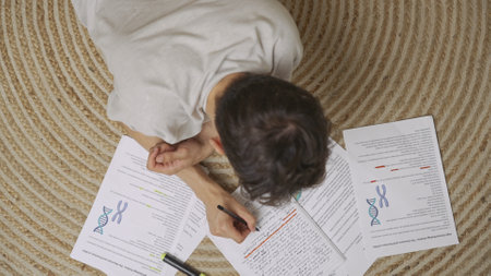 Focused adult man college student sitting on the floor in apartment room at daylight and doing homework writing in notebook. Education concept. Top view.