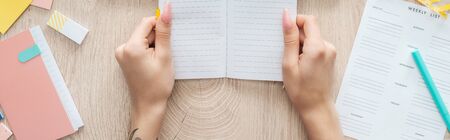 cropped view of woman holding notepad in hands over wooden table with weekly list and stationery