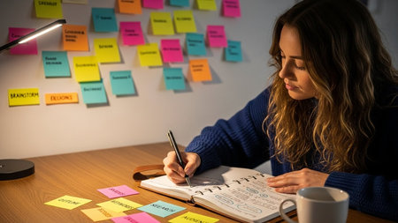 Desk scene with notepad, sticky labels, and open planner under soft lighting