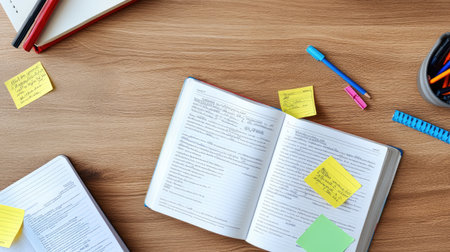 Top view of a study session with multiple open books, notebooks, and colorful sticky notes on a wooden surface