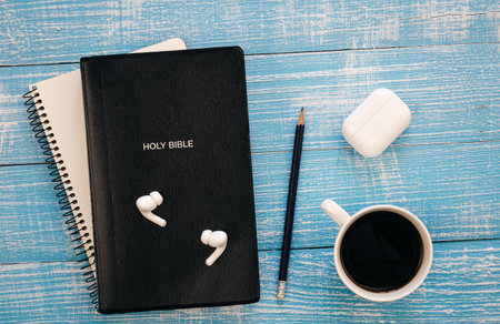 Bible, notebook, earphones and coffee cup on blue wooden background, flat lay.