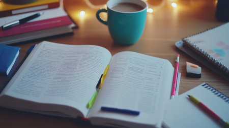 Neatly organized study desk with open textbooks, notebook, highlighters, and a cup of coffee in soft natural lighting