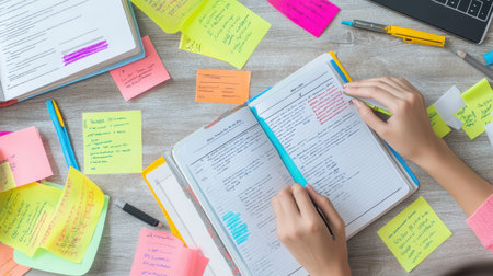 A vibrant and organized study space showcases a notepad filled with handwritten notes and colorful sticky notes, perfect for enhancing focus and productivity.