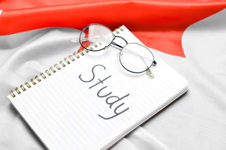 Notebook with word STUDY and eyeglasses on Canadian flag