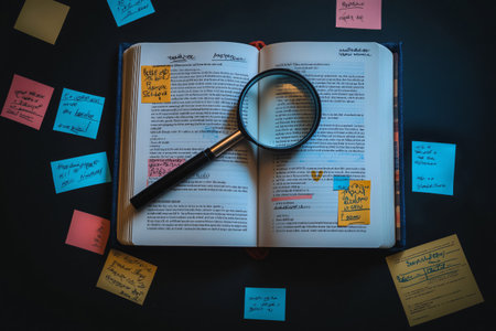 Open book with a magnifying glass resting on top, surrounded by colorful sticky notes, suggesting in depth research and analysis
