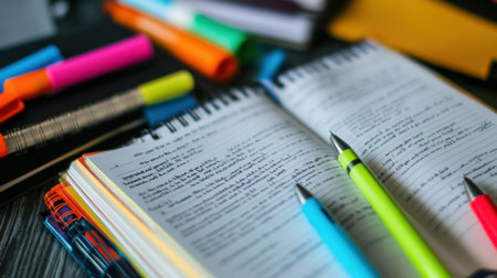 A vibrant workspace featuring an open notebook filled with study notes, surrounded by colorful highlighters and pens, perfect for educational use and creative projects.