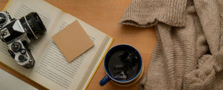Top view of study table with coffee cup, sweater, opened book, notepad and camera on wooden table