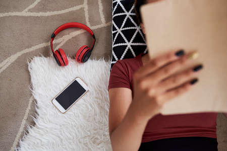 Female student putting aside her gadgets when reading a book for classes
