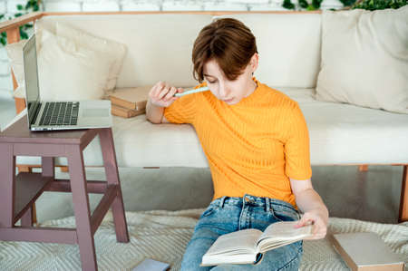 A teenage girl is sitting on the floor with a book and laptop