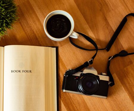 analog black camera with a book and cup of coffee