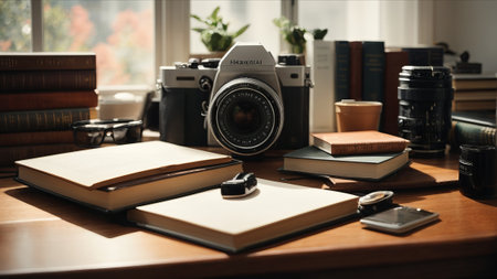 An antique camera sits prominently amidst open books, art supplies, and stationary. The scene incorporates a variety of colors and textures, enhanced by soft lighting. The composition suggests creativity and knowledge, suitable for projects related to design and history.