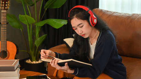 Beautiful young woman listening to music on headphone and reading book, spending leisure time in cozy winter or autumn weekend at home.