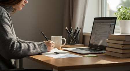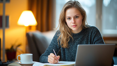 Woman studying at a desk with a laptop, taking notes and drinking coffee in a cozy home environment.