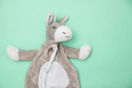 Isolated children's toy against a blue texture background, teddy bear from childhood, an old torn pink centipede